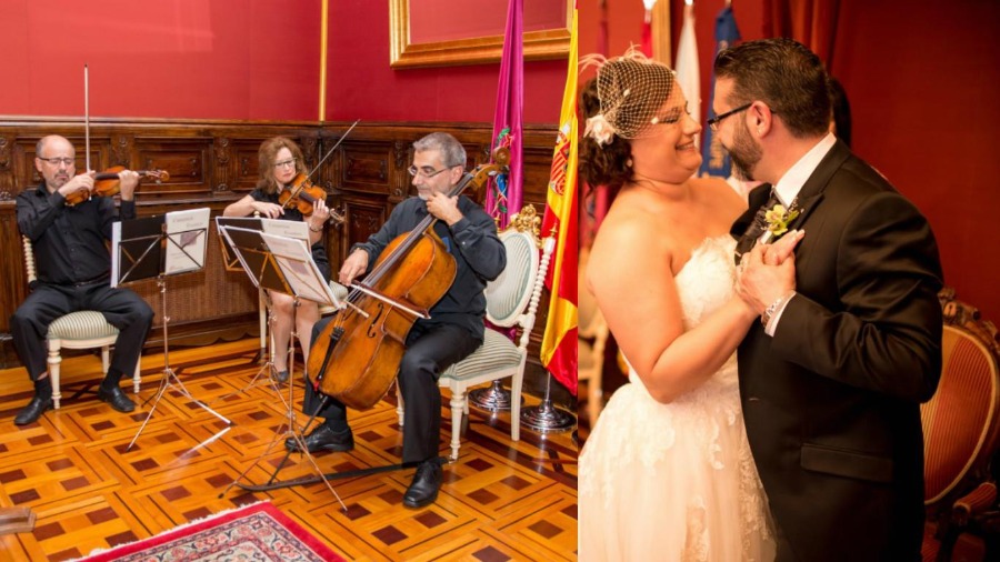 “Destacar la flexibilidad, amabilidad y profesionalidad del equipo. Elaboramos un programa especial, con alguna pieza de las que no existían ni partituras de cuerda, pero ellos las adaptaron desde las originales que les remitimos, y quedó espectacular. Vera, como portavoz del equipo, en todo momento pendiente de que todo quedara a nuestro gusto. La profesionalidad del grupo no tiene comparación. Pudimos incluso permitirnos el lujo de bailar como fin de la ceremonia uno de los famosos tangos de Gardel, " Por una cabeza", que ponía los pelos de punta. No tengo más que palabras de agradecimiento y felicitaciones, para Camertón Eventos, de quienes sobre todo destaco de nuevo la profesionalidad, algo que se encuentra en muy pocas ocasiones en grupos para bodas.” (Ester, Ayuntamiento de Santiago de Compostela, 2024)
